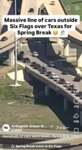 先日SNSで話題になっていたのだが、アメリカ春休み最終の週末に発生した「スタジアム近隣の遊園地:シックスフラッグス・オーバー・テキサス(Six Flags Over Texas)への入場待ち」で、フリーウェイの片側車線が完全に埋め尽くされるほどの大混雑が発生していた。